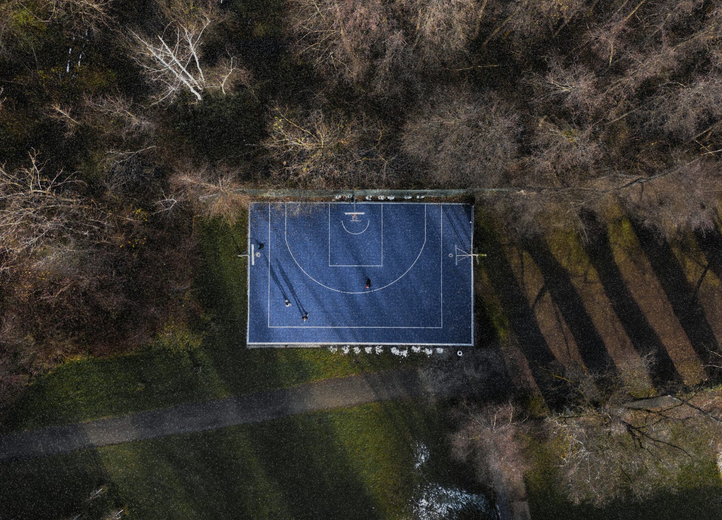 They paved the basketball court at the park in blue and it announces itself as not-lawn. The neighbors take their son to the playground, where he—barely walking—watches games through the chain-link fence. We hand him the ball and he drops it over and over again, delighted. Practice makes possibility more than it makes perfect. A dribble’s becoming. He can do it between swings and next to the slide and beneath the monkey bars.